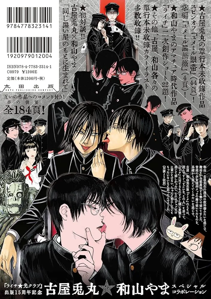 古屋兔丸,日本漫画家。男,出生于日本东京,毕业于多摩美术大学美术学部绘画科(油画专业),1994年,在月刊『ガロ』上以《Palepoli》初次亮相。在美学风格上,大正校服、仪式化的故事与舞台化的背景设定、神秘而危险的制服少年角色、对于神秘学与博物学的诸多引用,可以明显看到《荔枝光俱乐部》受到了丸尾末广的风格的影响。事实也正是如此,古屋兔丸在1985年冬天的高二时期观看了东京大木偶剧团的舞台剧《光之俱乐部》,对其中的舞台效果与美学风格感到着迷,甚至想要加入剧团,然而没想到等他要加入的时候剧团已经解散了。在20年后,他绘制了漫画《荔枝光之俱乐部》,便是以此舞台剧为原本。不过虽说是改编,古屋兔丸却在其中原创了许多自己的东西。而受到丸尾末广风格的影响也是从观看这个舞台剧开始,在漫画中,还可以看到对于丸尾末广舔眼球嗜好的致敬,以及在漫画中,主人公之一的ゼラ所遇见的占卜师也是“丸尾末广”。